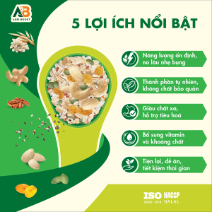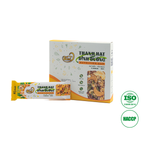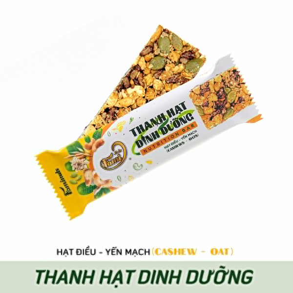 Sản phẩm chế biến từ nguyên liệu chính là hạt dinh dưỡng như 26% hạt điều, yến mạch, hạt bí xanh, gạo lứt huyết rồng… kết hợp vị ngọt tự nhiên từ mật dừa nước, mạch nha và xoài sấy. Tất cả nguyên liệu đầu vào được chọn lọc theo tiêu chuẩn khắt khe nhất và được sản xuất tại nhà máy đạt tiêu chuẩn quốc tế HACCP, ISO 22000:2018.